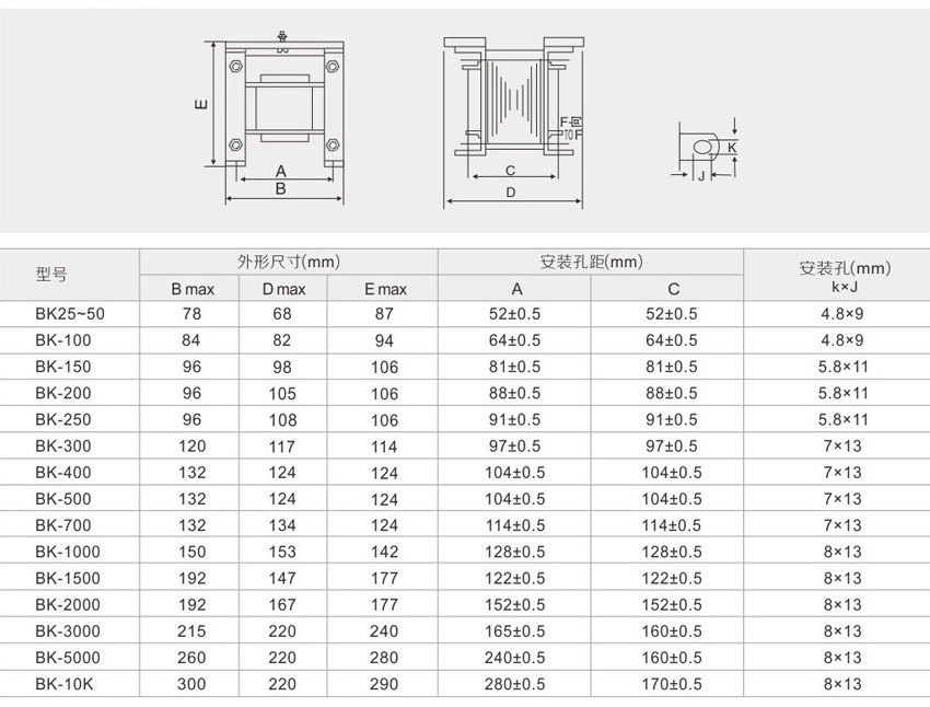 BK系列控制变压器适用于50-60Hz电压至500V的电路中,通常用作机床控制电器局部照明灯及指示的电源之用。本类型变压器按结构可分为壳式,按安装方式可分为立式。