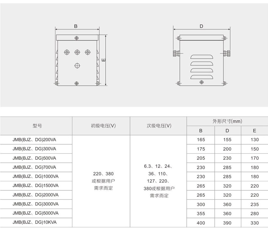 JMB、BJZ、DG、BZ型系列照明变压器适用于交流50Hz,电压500V及以下的电路中, 作为机床及其它设备的局部照明灯电源。 JMB、BJZ、DG、BZ系列变压器是由BK系列变压器和防护外壳构成,外壳两侧有供输入电源和负载接线用的接线柱,并有供接地用的接地螺钉。